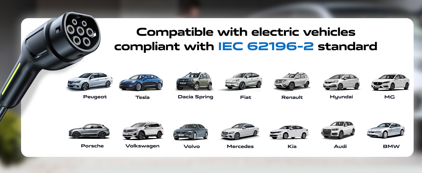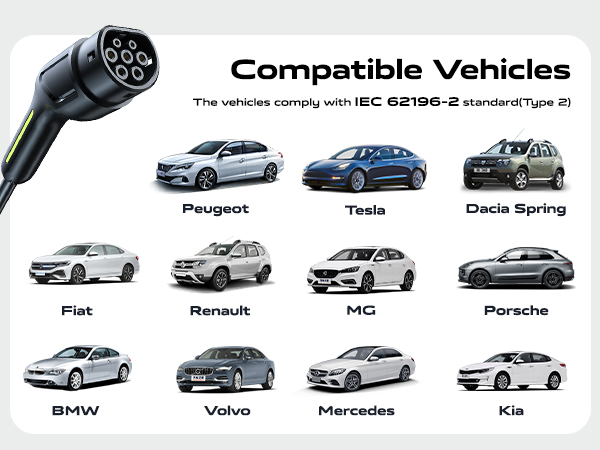 VDLPOWER EC21 electric vehicle charging cable is compatible with almost all UK models equipped with type 2 charging ports (IEC62196-2 standards), and can charge vehicles of various makes: Tesla, Peugeot, Dacia Spring, Tesla, Fiat, Volvo, Mercedes-Benz, BMW, etc.